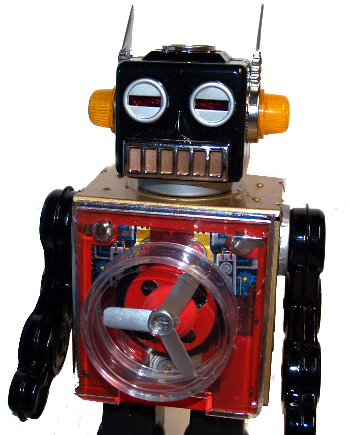 Mr. Pilot Robot Prototype. Only one ever produced based on original concept by H.I. Gosses Aviator Robot. This was intended to be production piece, but only a few sample versions were produced in Japan, and each one was different. Battery operated action with lighted eyes, spinning propeller and light in chest.