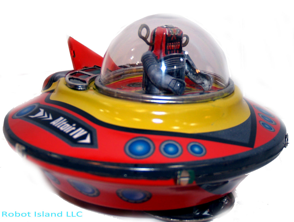 Flying Saucer Altair IV. Rare extreme limited edition with Robot Driver. Flying saucer design just like the original vintage 1950's tin. Crank windup mechanism sometimes referred to as "flywheel", and features bump and go action and nicely detailed green astronaut under his plastic dome. Measures 6" across. Worldwide shipping. All items inspected and tested before shipping. Satisfaction Guaranteed! Tin Space Ships and Robots are adult collectibles not for children.
