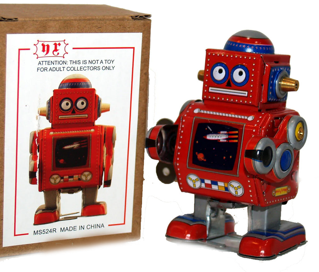 Red Mini Robot. Very colorful little tin toy windup Robot standing 3" tall. Incredible graphic detailing incorporating classic Robot features. A sturdy little Robot with posable arms complete with his own key and gift box. Please note Tin Toys are for adult collectors and not intended for children. All Robots from Robot Island LLC are guaranteed new direct from the factory and produced in the same manner as they were in the 1950's. Hand assembled and machine stamped. This process sometimes incurs minor rubs which is normal for this original primitive style of tin toy production.