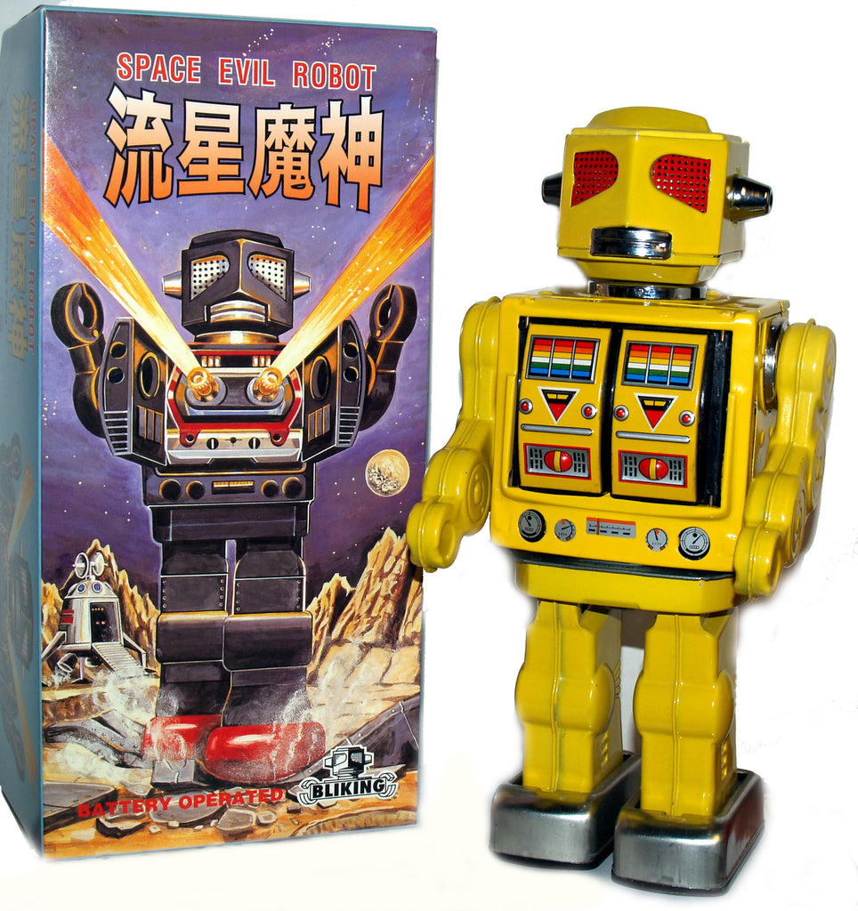 Space Evil Robot Yellow. Very rare since only a few were found at Metal House factoy prior to closing many years ago. Classic Horikawa Style boxy design a/k/a "Metor Demon Man." This is a true high quality collectible Robot produced by Metal House Japan in rare Yellow color. Robot stands 12 inches tall. One of the most well known Robots for it's Rotatomatic Action, Stop 'n Go, Swinging Doors and Blinking Shooting guns. Rare version from Metal closed several years ago.