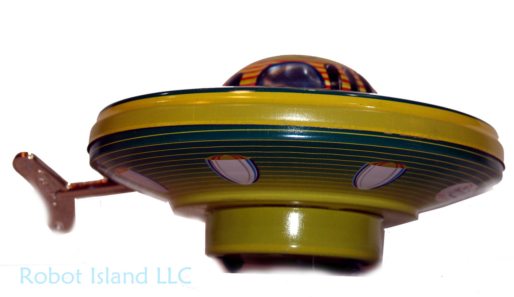 Flying Saucer UFO. Windup Flying Saucer featuring aliens and space graphics. Design elements of classic 1950's Sci-Fi movies. Cool windup action featuring forward traveling, stops and spins around, then takes off in different direction. Action repeats. Colorful graphics. Measures 5" in diameter. Tin Space Ships and Robots are adult collectibles not for children.