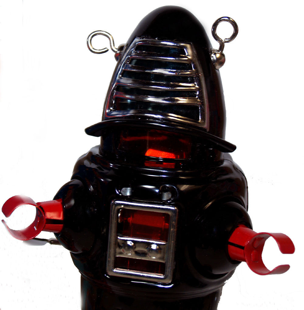 Wind-up Action Planet Robot. Exact replica of the 1950's all-time favorite Robby the Robot. Stands 8 1/2" tall and walks with sparkling action behind red cello face shield. Complete with fantasy box. Many versions of Robby the Robot toys have been created, but "Action Planet Robot" always holds a place in every robot collection. All tin toy reproduction robots are inspected and tested before shipping from Robot Island. All tin toys are produced in same manner as in the 1960's with heavy stamping machines and hand assembled. This authentic manner of production often has minor flaws or rubs. Satisfaction guaranteed! Also available in Red and Green versions in separate listing.