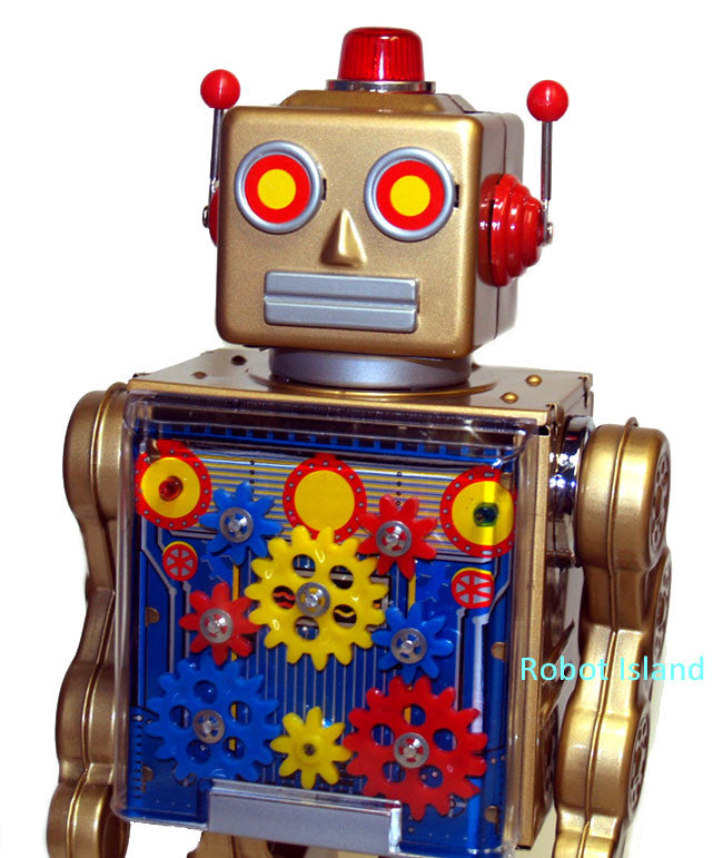 Gold Gear Robot by Metal House Japan. Stands 12" tall and functions include mechanical walking action, swinging arms, and spinning gears in the chest with blinking lights. Battery operated tin toy robot based on the classic styling of the 1960's Japan Horikawa Robots. Direct from the original factory which is no longer in existence. Includes original box with inserts. This version was created in late 1990's. Factory closed a long time a go and never to be produced again.