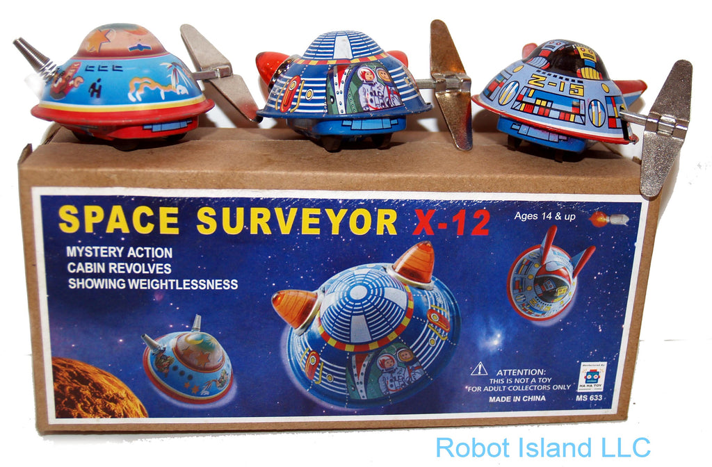 New Wind Up Flying Saucer Space Surveyor Fleet. Mint and boxed! Set is complete with 3 windup flying saucers. Saucers scoot around and then when metal key hits floor they changes direction. Nice detailing on each saucer with different features such as springy antennas and colored plastic domes. Even the underbelly is lithographed. Tin Space Ships and Robots are adult collectibles not for children.