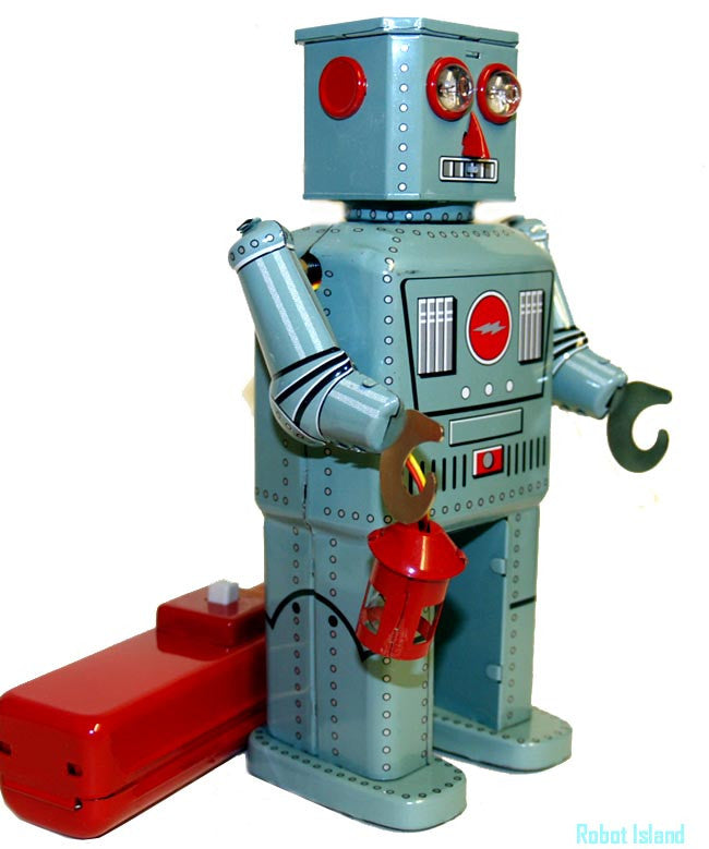 Original 1950's Lantern Robots sell for as much as $7,500 mint in box. This is your chance to own an exact replica at an affordable price. Manufactured by the HaHa Toy Factory - the leading manufacturer of Vintage Style Robots! Robot Island is the only retailer that imports all of its Tin Toys direct from the factory so you are guaranteed a brand new Robot. All of our Robots are produced in the same manner as they were in the 1950's and 60's by primitive stamping machines and then each hand assembled. Each Robot has its own unique character. It is normal for some minor rubs or marks to occur during this original method of hand assembly.
