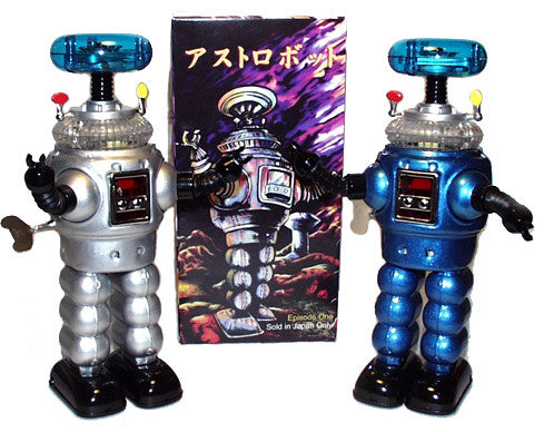Lost in Space Robot YM-3 Blue. Everyone's favorite Robot is finally available as a motorized tin toy wind-up. Strong walking mechanism with sparking feature in chest and lower dome. Robot stands 9 inches tall and features metal antennas and translucent blue top dome.